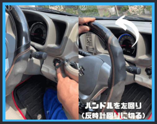 エンジンOFFの状態ではハンドルロックが掛かるので、エンジンを掛けた状態でハンドルを切ろう。