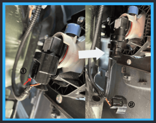 バルブはそのままでは外せないため、先にカプラーを引き抜きます。カプラーは赤矢印の爪をつかんだ状態で下に引っ張るだけ。