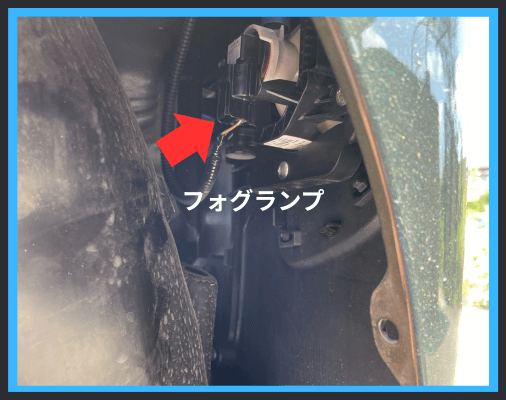 めくった時に奥に見える矢印の箇所がフォグランプのバルブ。