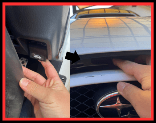 ここではあくまで半開きなので、赤丸の部分を矢印方向に押し込んでボンネットを完全に開きましょう。